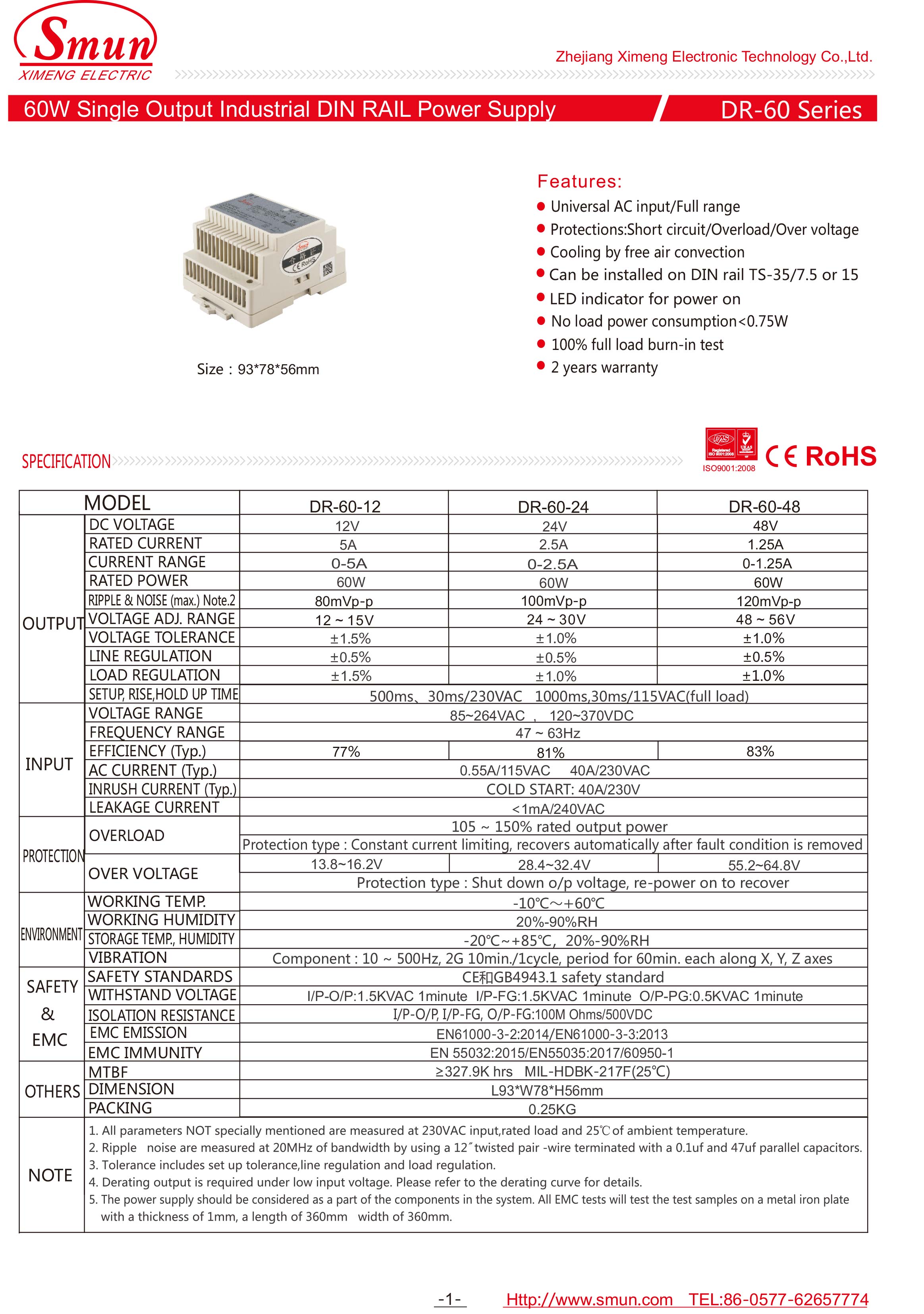 تم تصميم DR-60 بغطاء بلاستيكي يمكنه بشكل فعال منع المستخدم من المخاطر الكهربائية. مع كفاءة تشغيل تصل إلى 83٪ ، يمكن للسلسلة بأكملها أن تعمل في درجة حرارة محيطة تتراوح بين -10 ℃ و + 60 تحت الحمل الحراري.