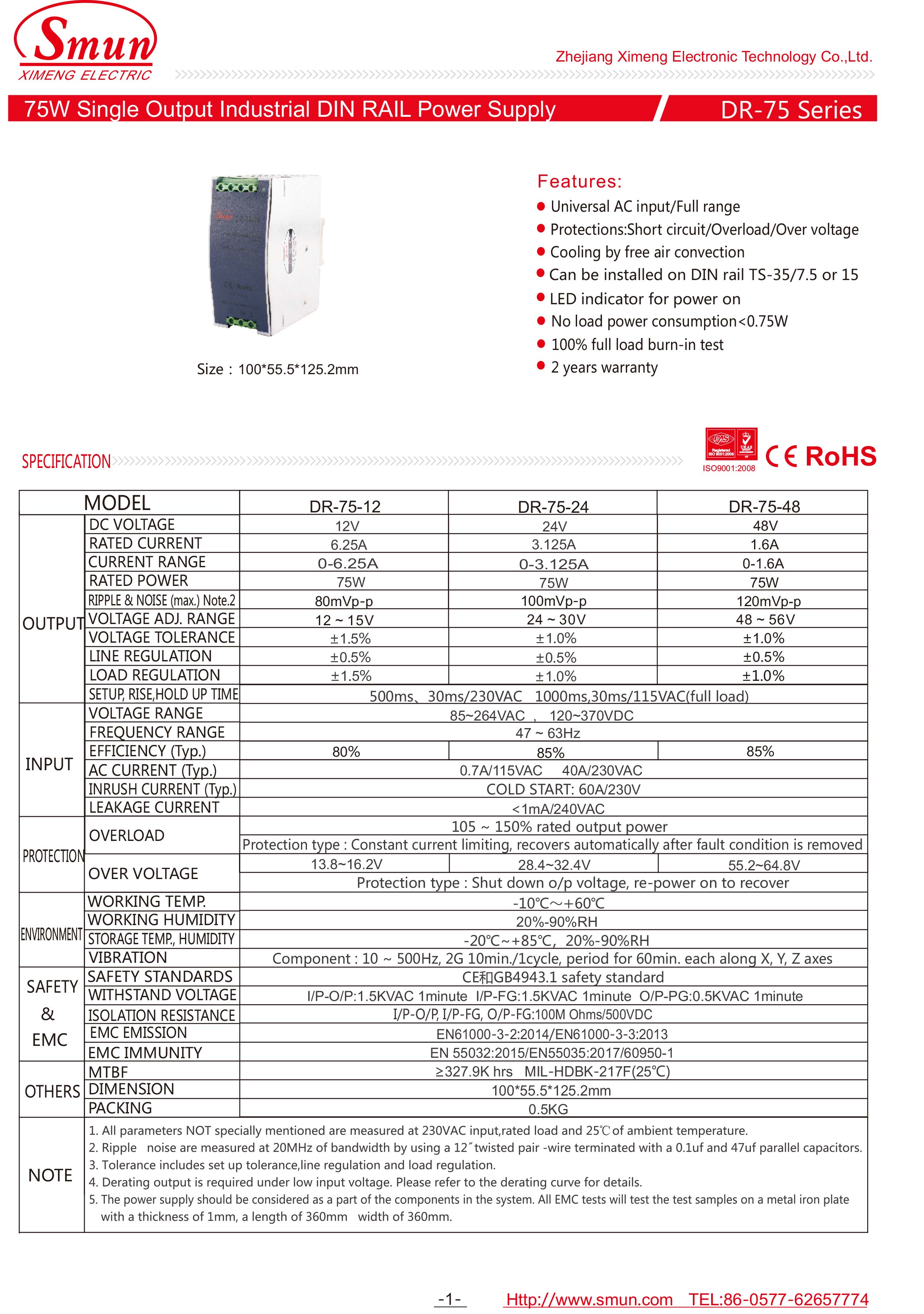 تم تصميم DR-75 بغلاف بلاستيكي يمكنه بشكل فعال منع المستخدم من المخاطر الكهربائية. مع كفاءة تشغيل تصل إلى 85٪ ، يمكن للسلسلة بأكملها أن تعمل في درجة حرارة محيطة تتراوح بين -10 ℃ و + 60 تحت الحمل الحراري.