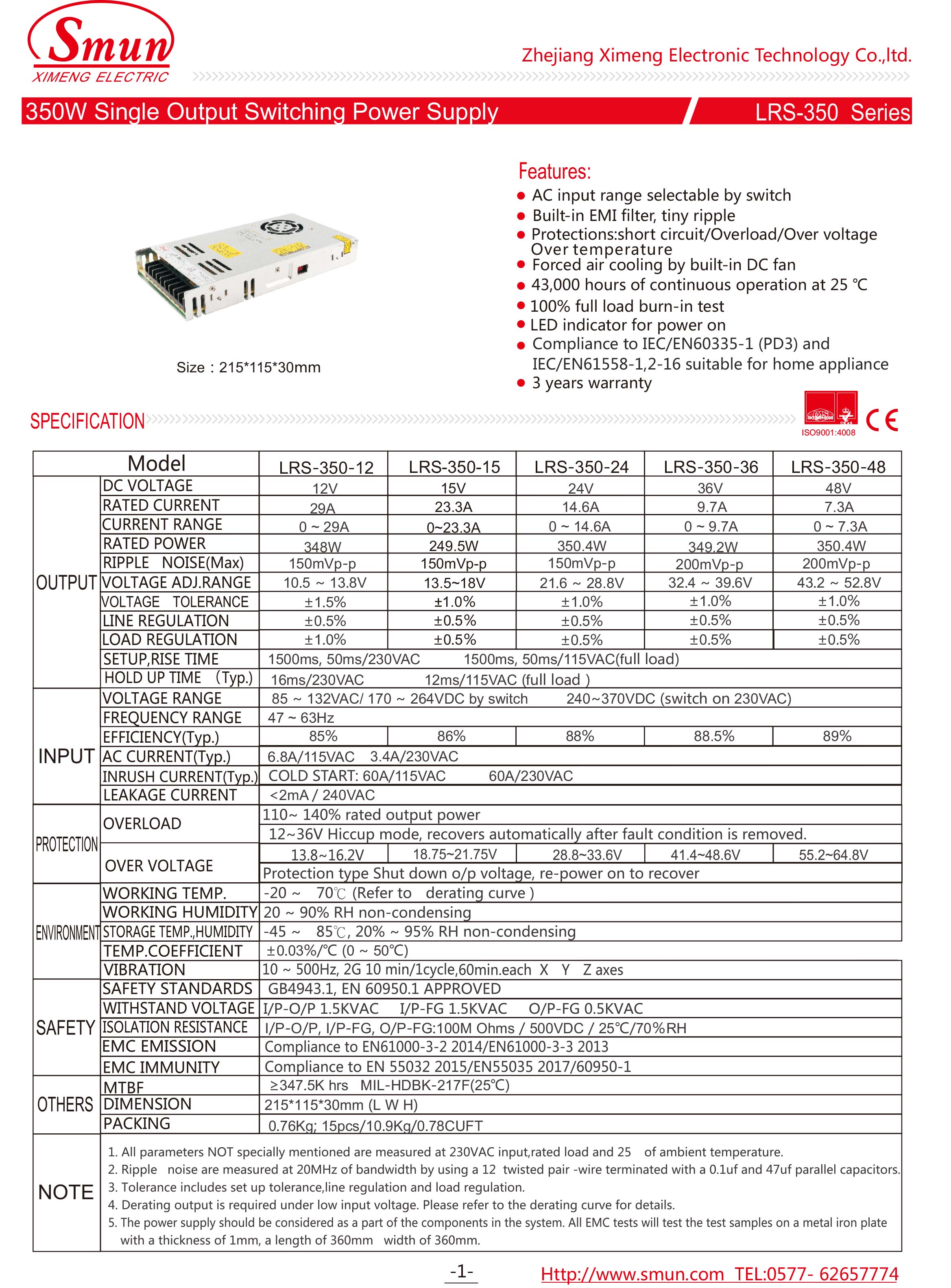 سلسلة LRS-350 عبارة عن مصدر طاقة مغلق من النوع المغلق بقدرة 350 وات مع تصميم منخفض الانظار بقدرة 30 مم ، وباعتماد إدخال 115 فولت تيار متردد أو 230 فولت تيار متردد (يمكن تحديده عن طريق المفتاح) ، توفر السلسلة بأكملها خط جهد إخراج يبلغ 12 فولت ، 15 فولت ، 24 فولت ، 36 فولت و 48 فولت.